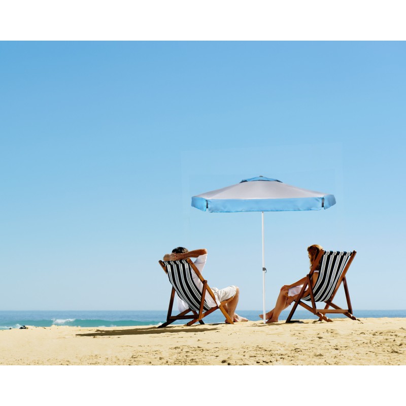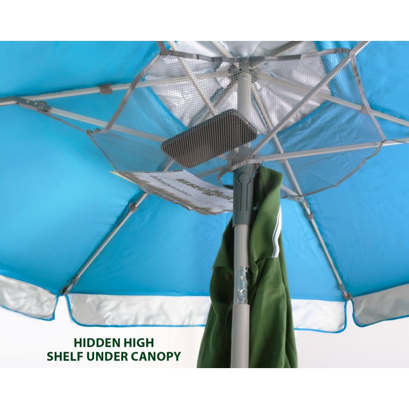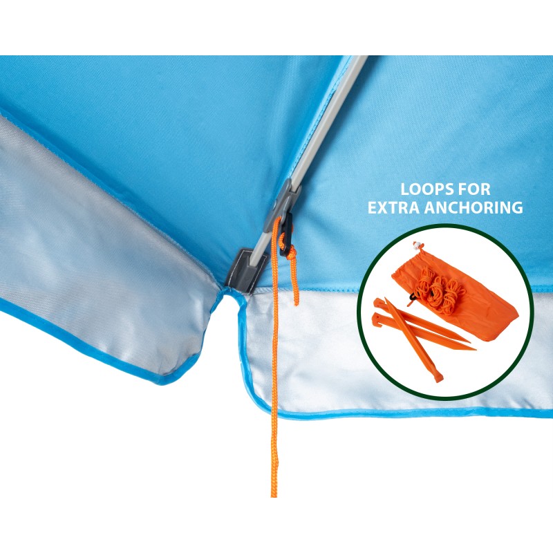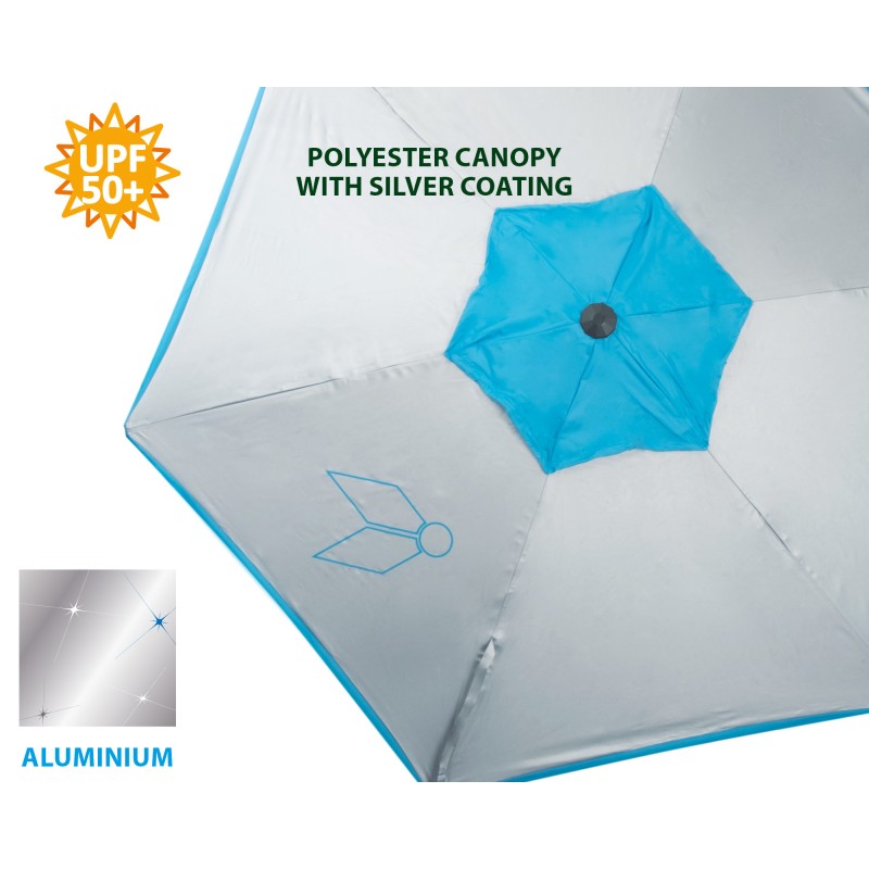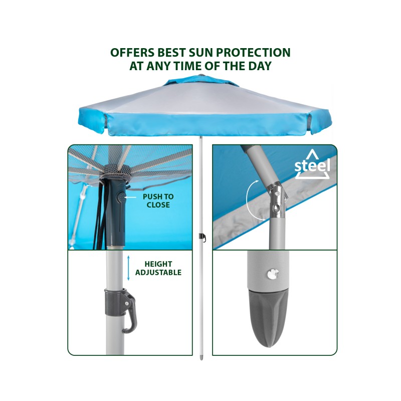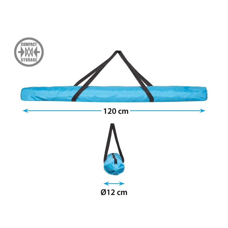 Moderner Strand und Sonnenschirm mit kompaktem Packmaß. Ausgestattet mit Aluminiumstiel und einem hochbelastbaren, UV-stabilen Schirmbezug. Zusätzliche Schlaufen an den Enden der Streben ermöglichen eine Abspannung gegen starken Wind. An der Unterseite des Sonnenschirms befinden sich 2 Haken und ein praktisches Netz für Utensilien. Durch die verstellbare Seitenneigung bietet der Schirm besten Sonnenschutz zu jeder Tageszeit. Inklusive Tragetasche.