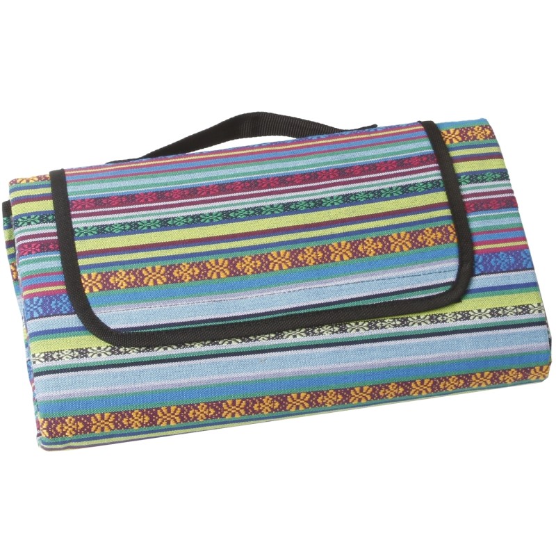 Coperta picnic arrotolabile realizzata in resistente tessuto di poliestere e lato inferiore idrorepellente.