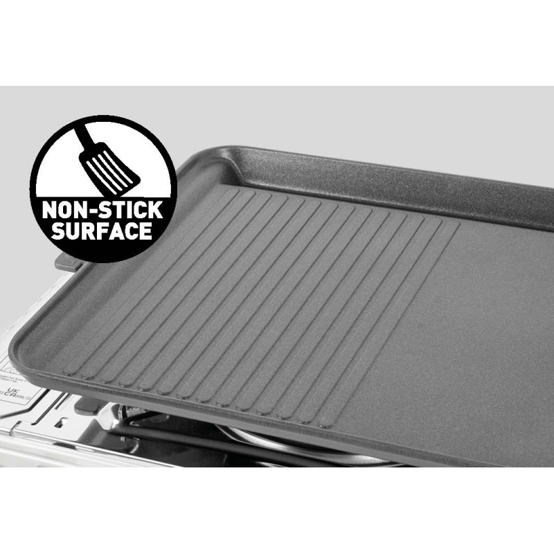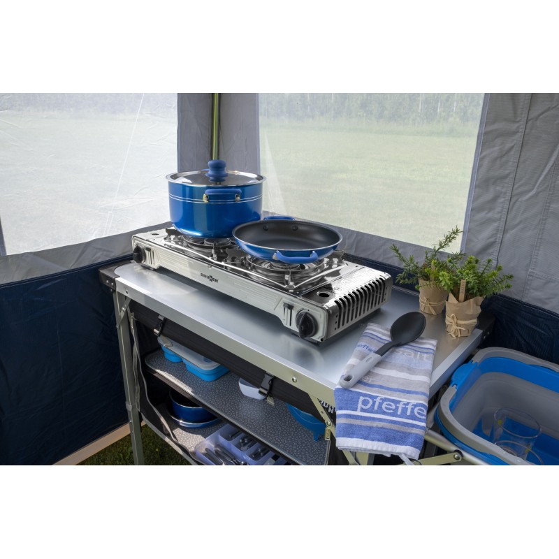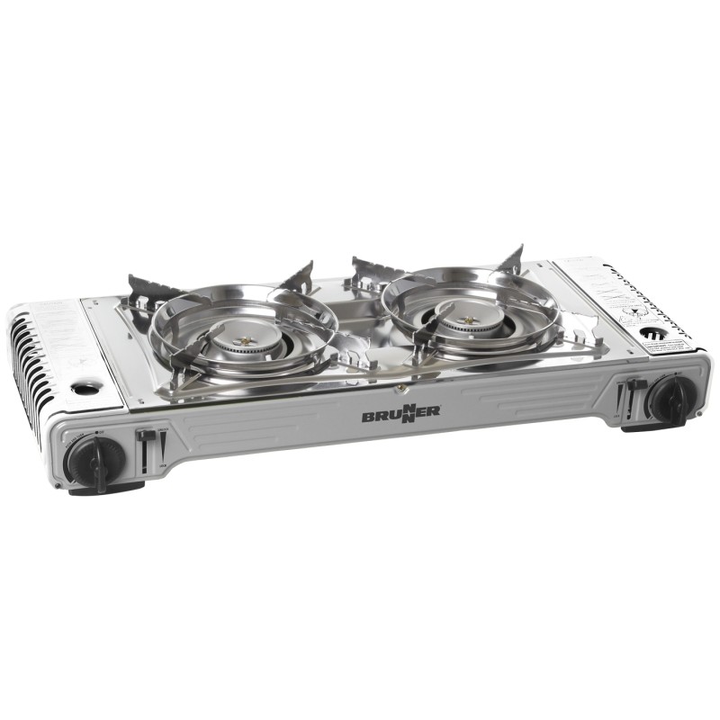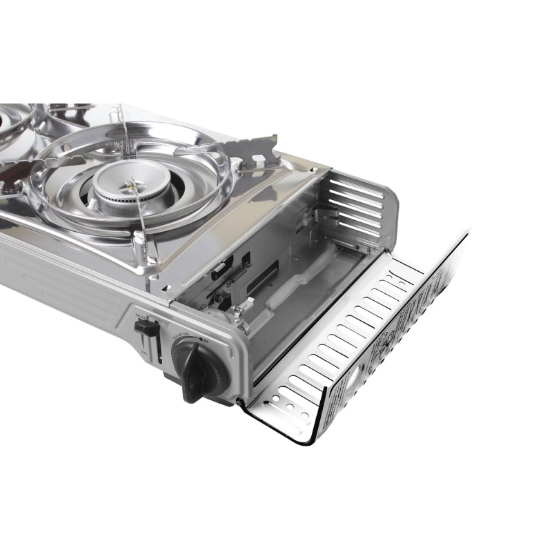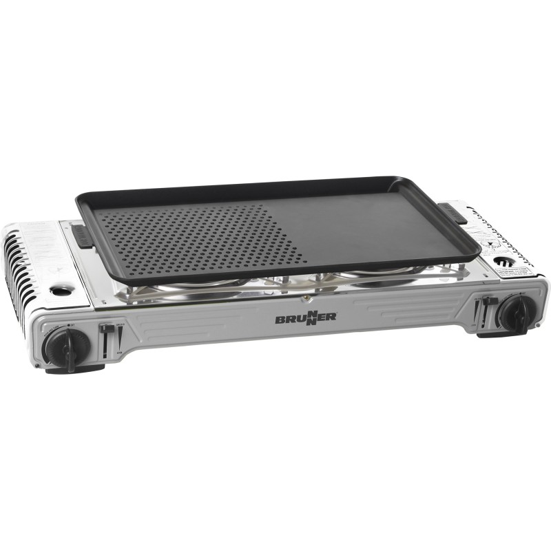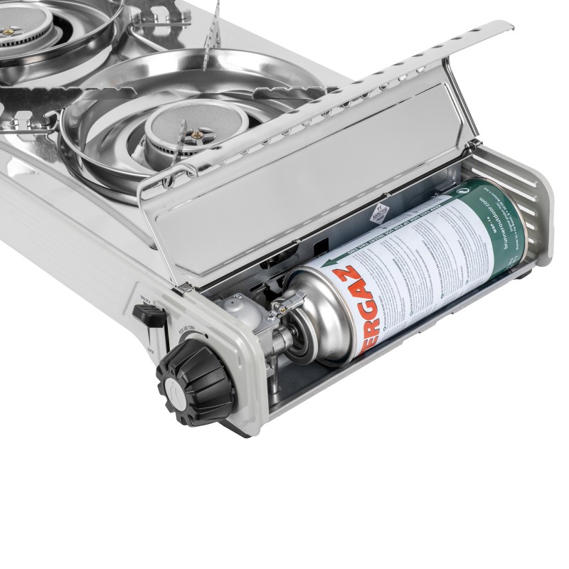 Fornello a doppio gas con due fuochi e con piastra grill, ideale per preparare diversi cibi contemporaneamente ovunque all’aperto.