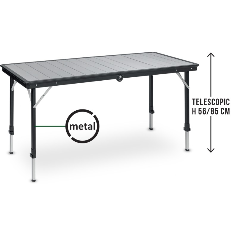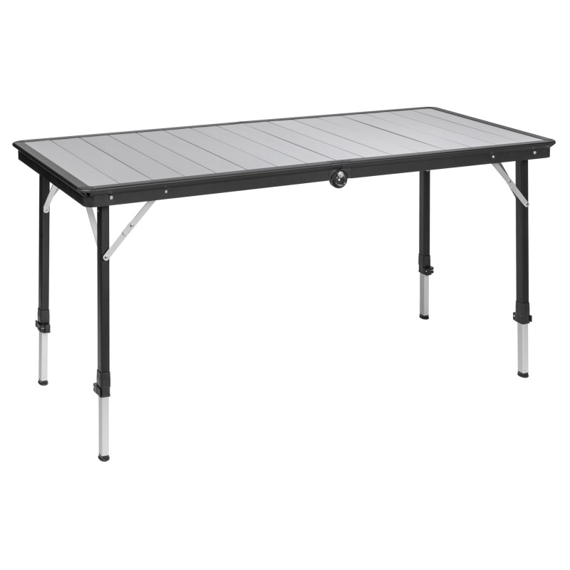 Il Dinemic 6 è un tavolo per Outdoor e Camping di alta qualità con uno speciale piano pieghevole realizzato con doghe di alluminio particolarmente resistenti alle intemperie e all'usura. La struttura in metallo verniciato a polvere è dotata di gambe regolabili in altezza. Una volta ripiegato, può essere riposto in modo molto compatto ed è quindi ideale per minibus, furgoni e camper.