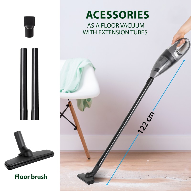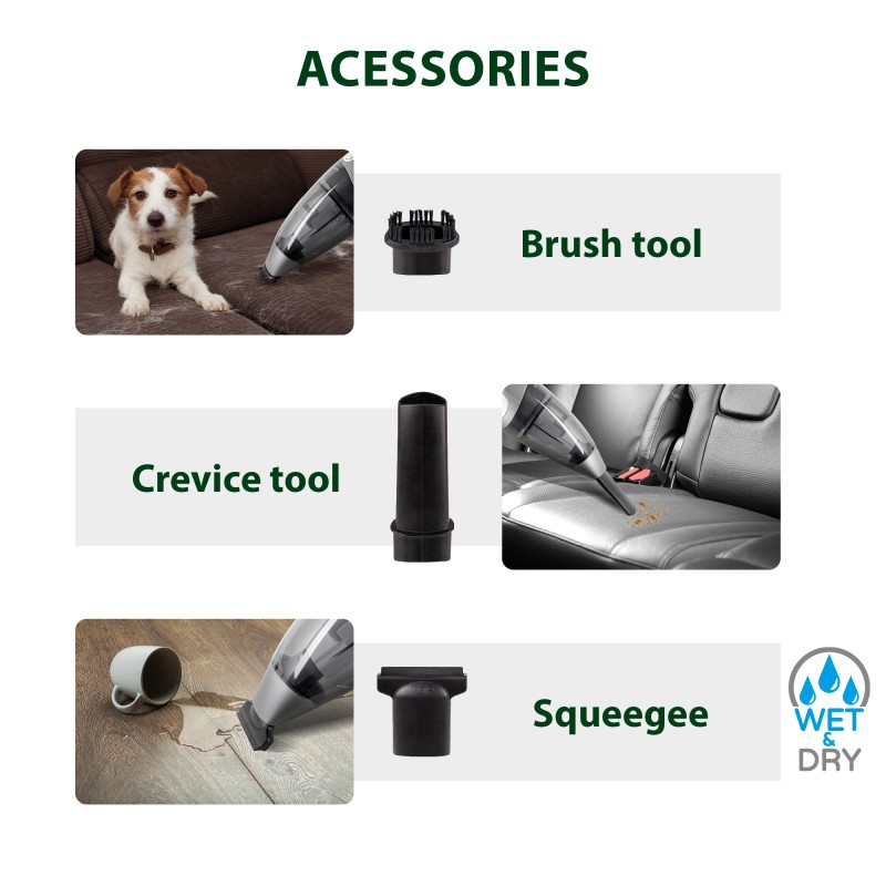 • Inclusi nella fornitura: bocchetta per fessure, spazzola per pulire, spazzola rotonda, bocchetta per liquidi, tubi di prolunga, custodia per il trasporto
