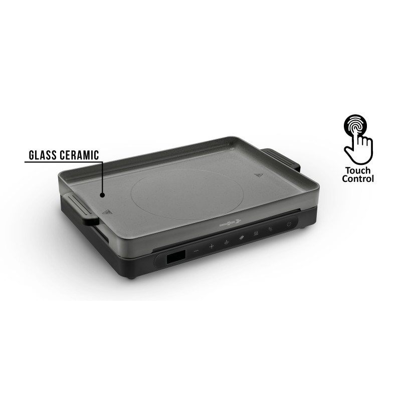 Fornello/Grill portatile elettrico dotato di monopiastra ad induzione. Costruzione solida e dal design moderno realizzata con corpo in PP termoresistente e superfice di cottura in vetroceramica ad alta resistenza. Ideale per l'utilizzo in ambito outdoor e campeggio, grazie a una zona di cottura con 9 livelli di potenza (da 300 a 2000W) selezionabili mediante comandi Touch control e display led. La fornitura comprende una piastra grill in alluminio predisposta per una termodiffusione omogenea, internamente rivestita in ceramica per delle cotture alla griglia davvero eccezionali.