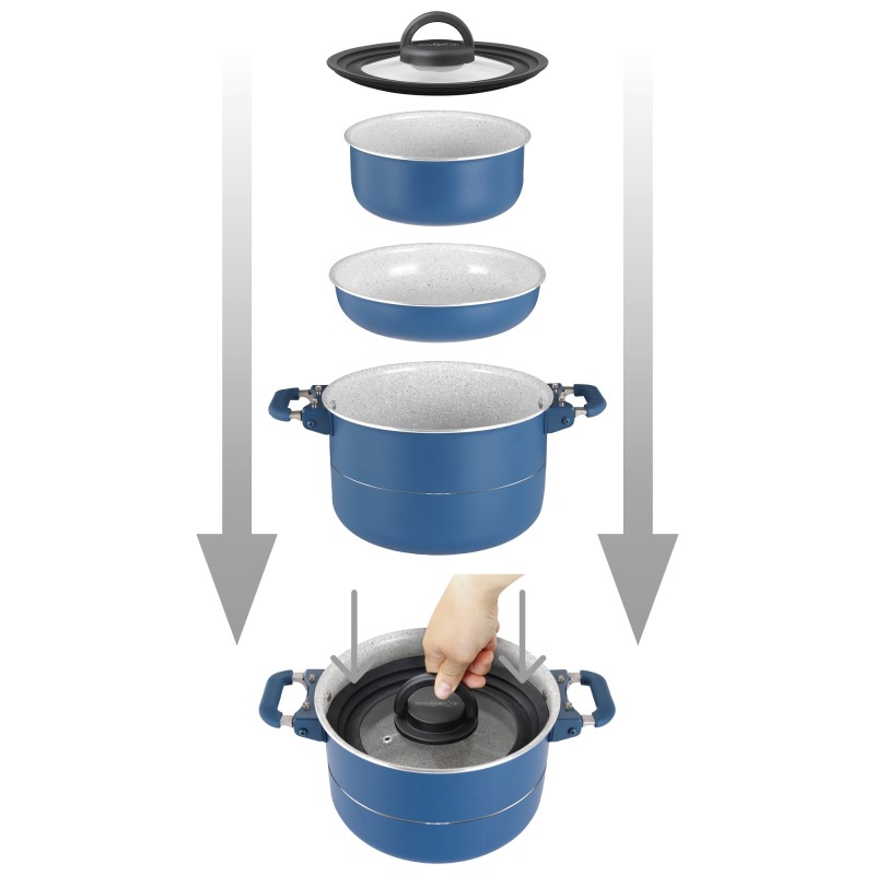 Questo set di pentole per veicoli ricreazionali e imbarcazioni è ideale per chi vuole cucinare in camper, caravan o barca. Il set è composto da pentole e padelle di alta qualità con base compatibile con l'induzione e rivestimento antiaderente in ceramica antigraffio. Le pentole possono essere impilate l'una dentro l'altra per risparmiare spazio e sono dotate di un sistema di maniglie e raccordi di nuova concezione (Magnetogrip), che consente di ridurre notevolmente le dimensioni della confezione dei set di pentole grazie all'utilizzo di maniglie pieghevoli con elementi magnetici integrati. Inoltre rende superfluo l'uso di una cinghia di fissaggio per stabilizzare pentole e padelle durante il trasporto.