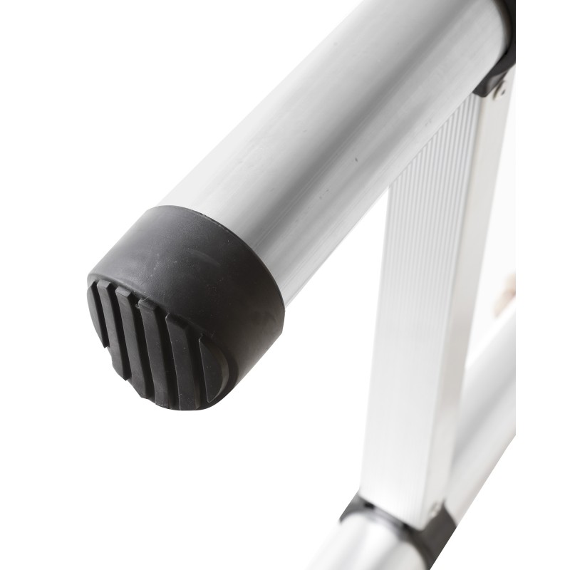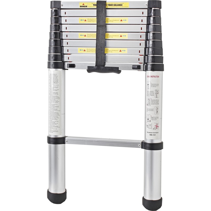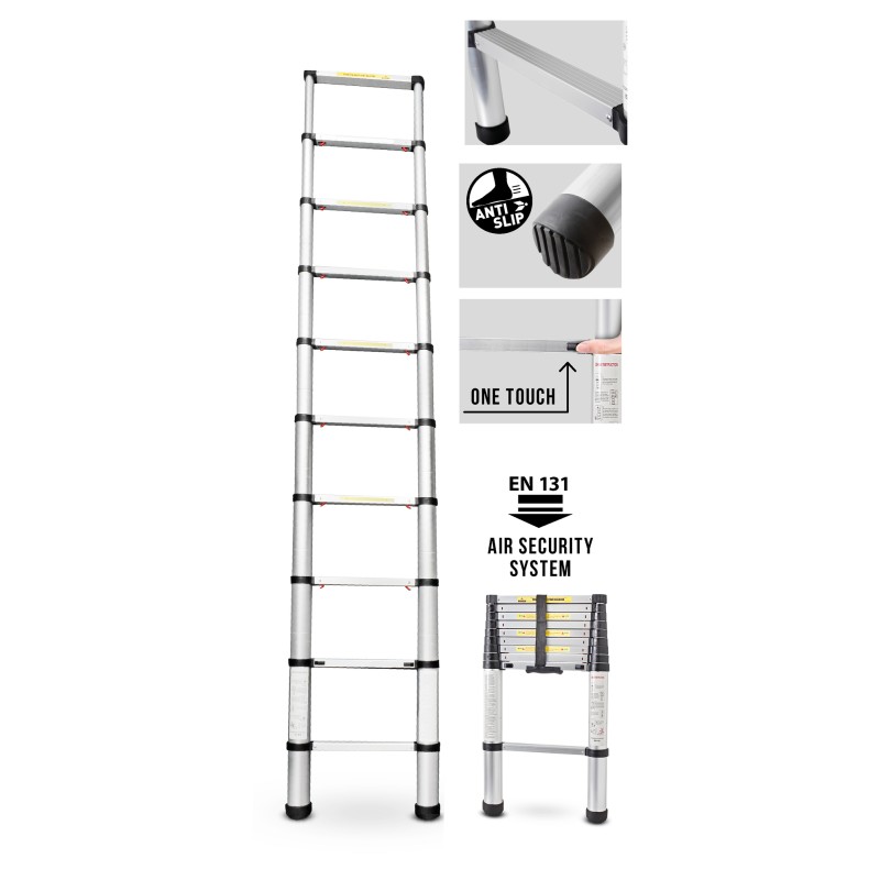Scala telescopica in alluminio con nuova tecnologia di chiusura morbida servoassistita che elimina il rischio di lesioni alle dita. Facile da trasportare e regolabile in altezza. Dotata di piedini in gomma antiscivolo per una maggiore sicurezza. Molto compatta quando chiusa.