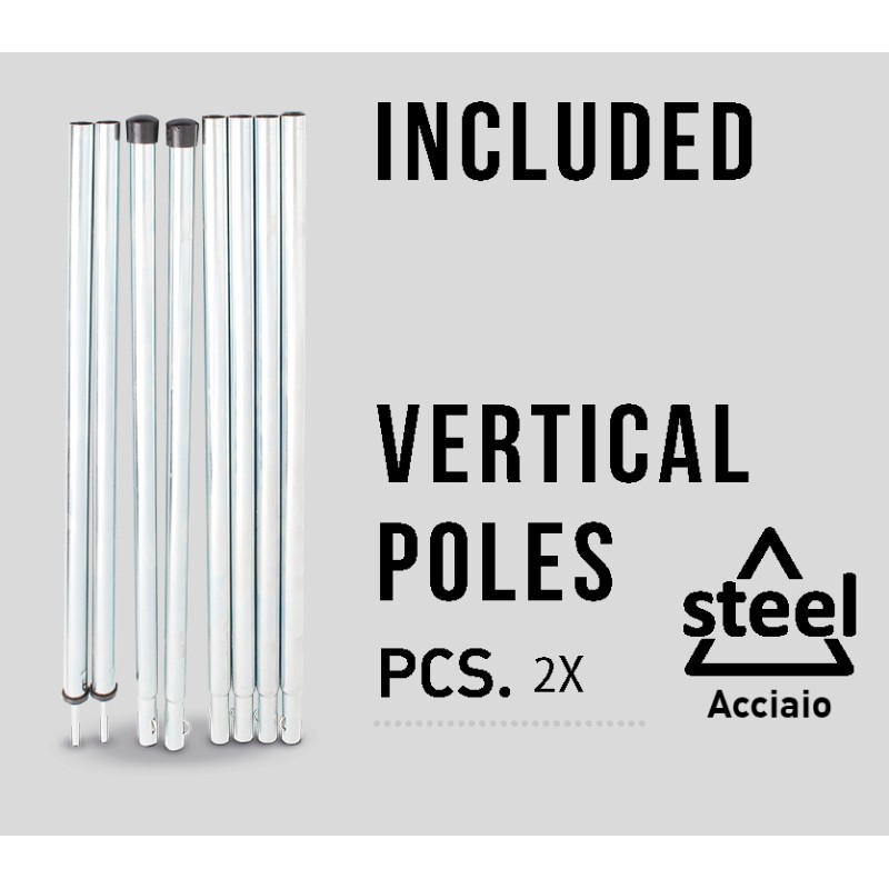 • La parete anteriore può essere alzata a tettuccio parasole, con 2 pali inclusi