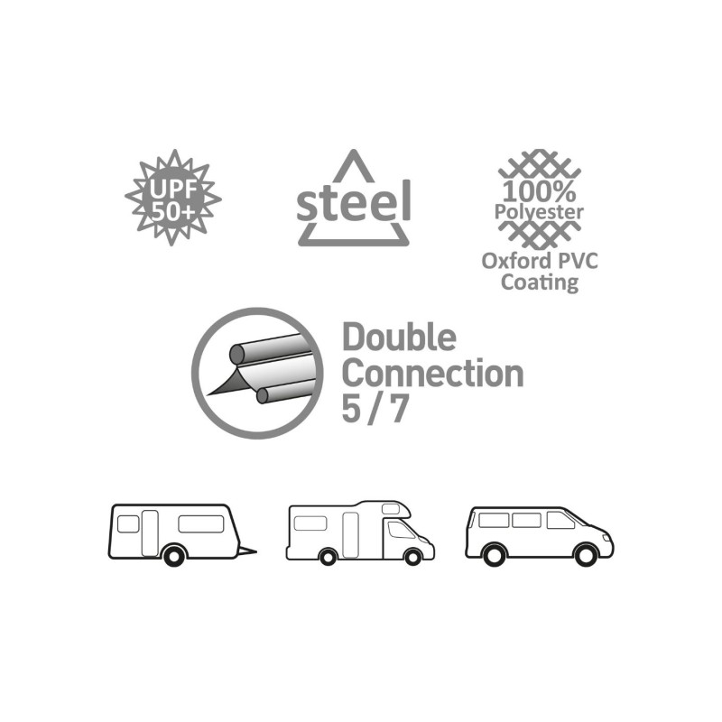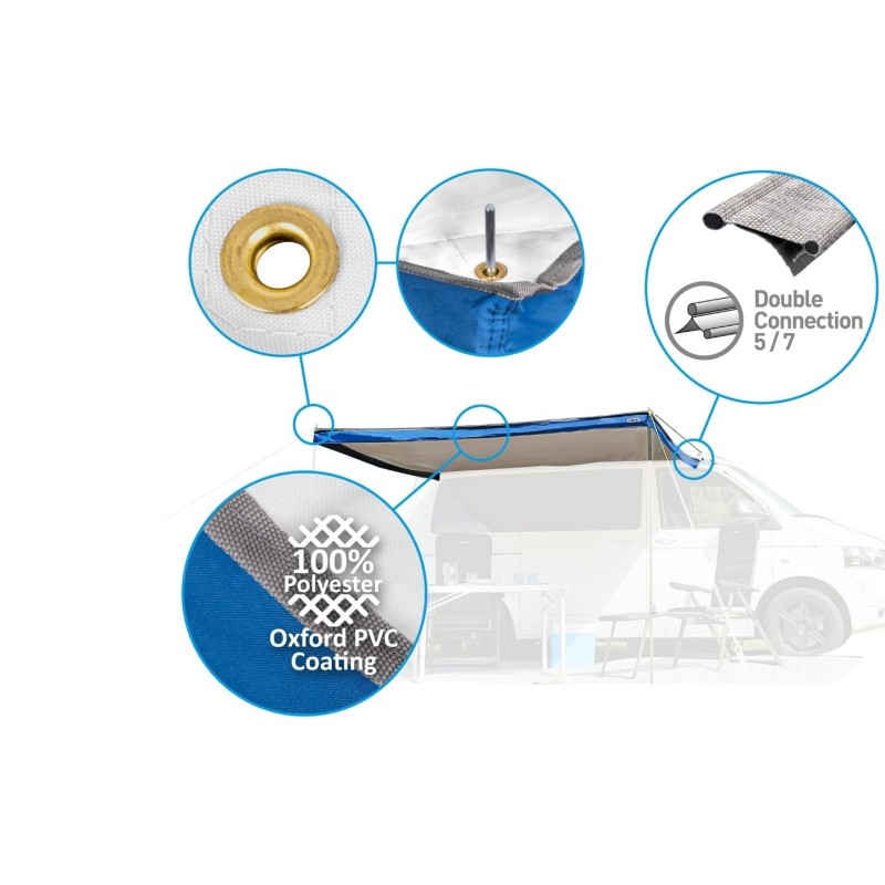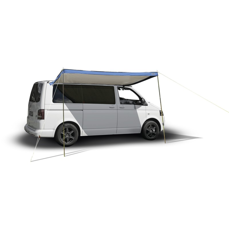 Tendalino parasole per Minibus. Il fissaggio al mezzo avviene tramite profilo di scorrimento o tramite palo di fissaggio in dotazione.