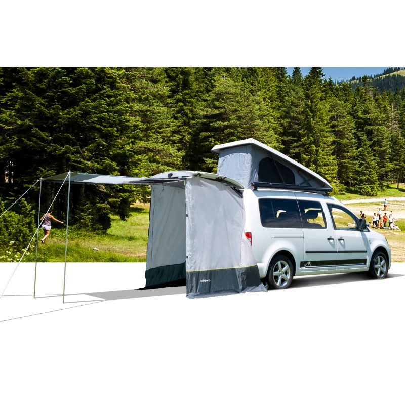 Tenda posteriore senza telaio appositamente sviluppata per essere fissata al portellone posteriore del VW Caddy. Ideale per creare ulteriore spazio nella parte posteriore del veicolo e per ottenere una maggiore libertà di movimento al suo interno. Montaggio semplice e veloce. 1 grande porta d'ingresso garantisce una buona ventilazione e un clima interno piacevole. Con materiale di fissaggio e borsa per il trasporto.